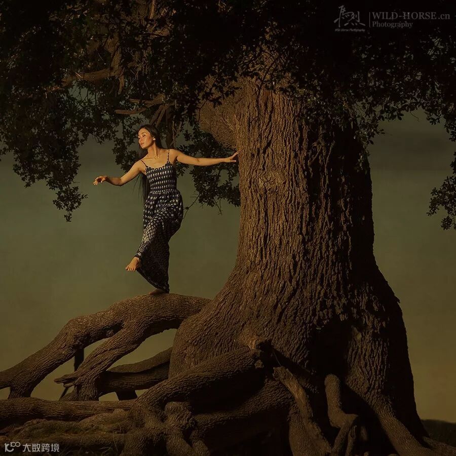 旅途中遇到一棵有如神话故事里的大树,用闪光灯透过柔光伞照亮人物和部分树干;