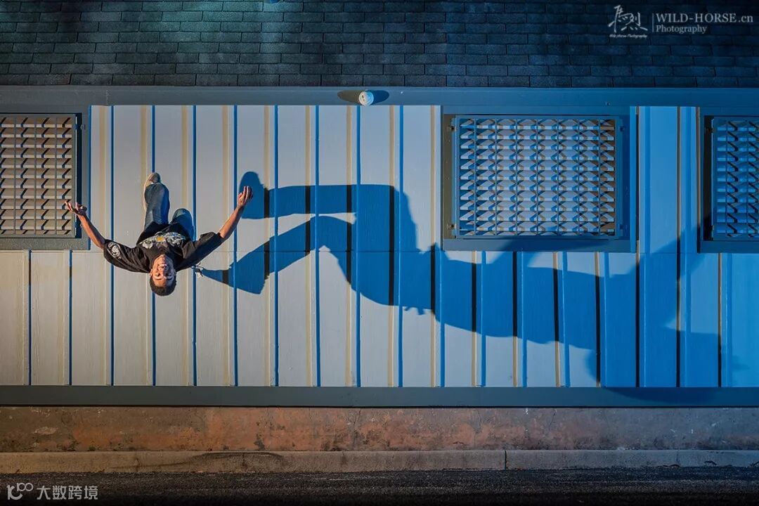 当画面里呈现出不寻常的空间,会立刻激起读者的好奇心,他们会试图用所知来分析、解释这个空间的形成,这样就使得照片更耐看了——那么这是一张俯拍的照片吗?事实上是正常的平视角度拍摄,由不简单的人物在墙面上做后空翻时看着镜头而成。