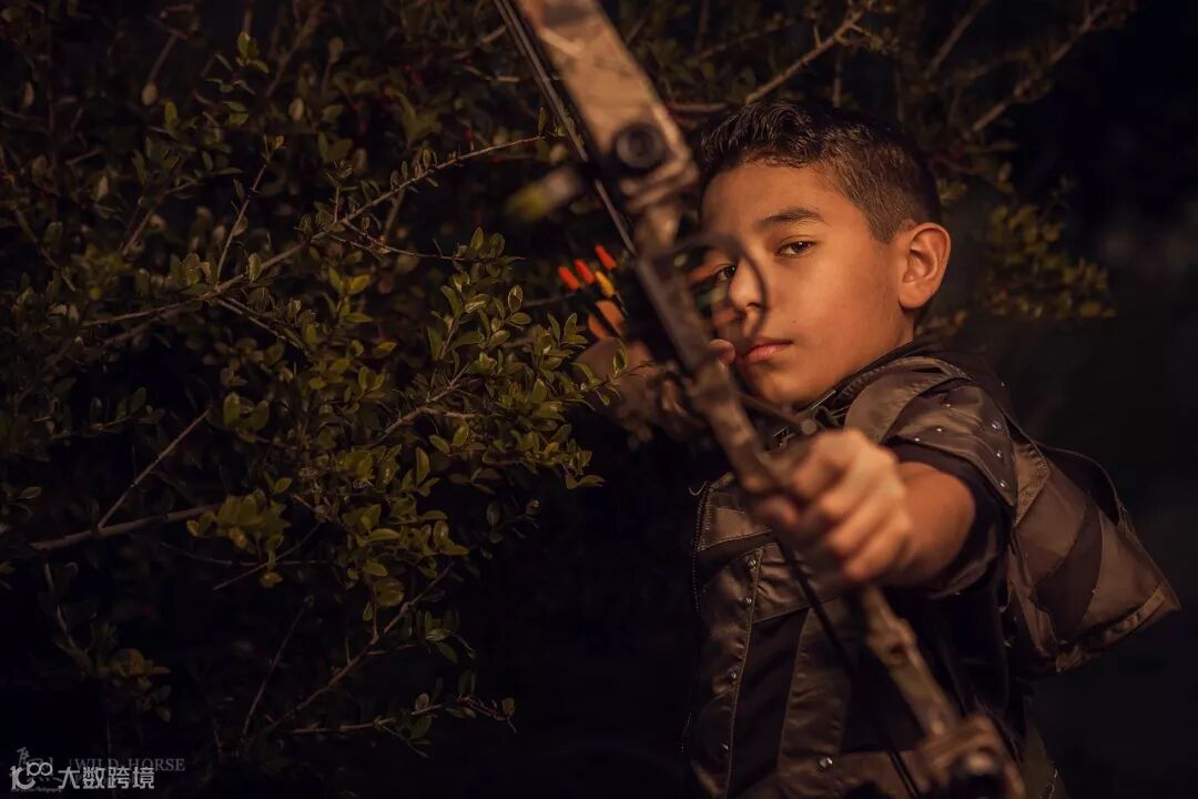 在停车场的草丛里,用闪光灯加橙色片,通过60x60cm的柔光箱放置在摄影师头顶稍偏右的位置,确保光线范围包含男孩的脸和伸出的复合弓,给观者以“我被瞄准了”的压迫感。