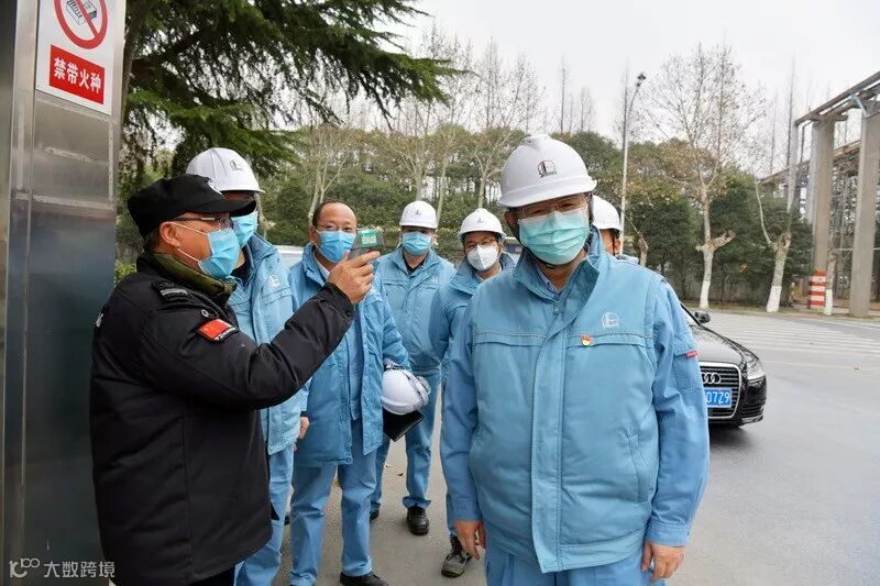 9:30,公司党委书记、执行董事万涛一行来到PTA部,门卫在给他们测体温。
