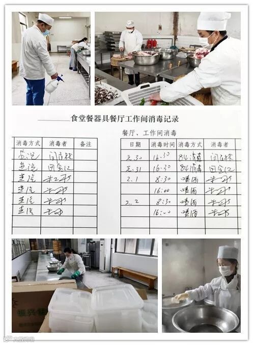 8:57,在公司机关食堂,炊事人员有的在准备午餐,有的在打扫卫生,给现场消毒,并提前准备好快餐盒,准备将午餐打包成盒,供职工单独用餐。