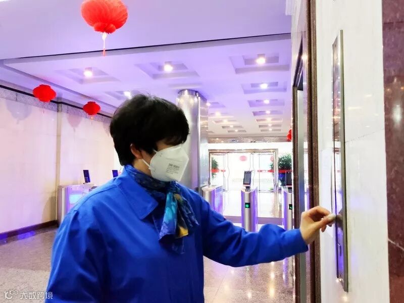 人员在给电梯按钮进行消毒。