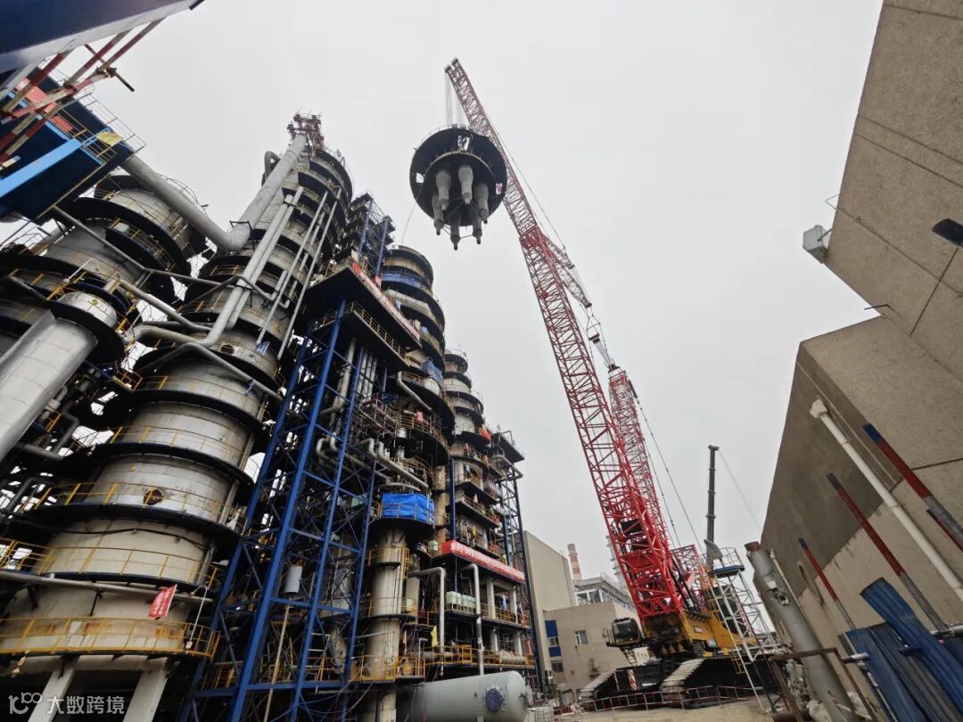封头与旋风分离器整体高11米,直径7.8米,采用整体吊装工法,重量高达160吨,是此次检修吊装设备中的“巨无霸”。