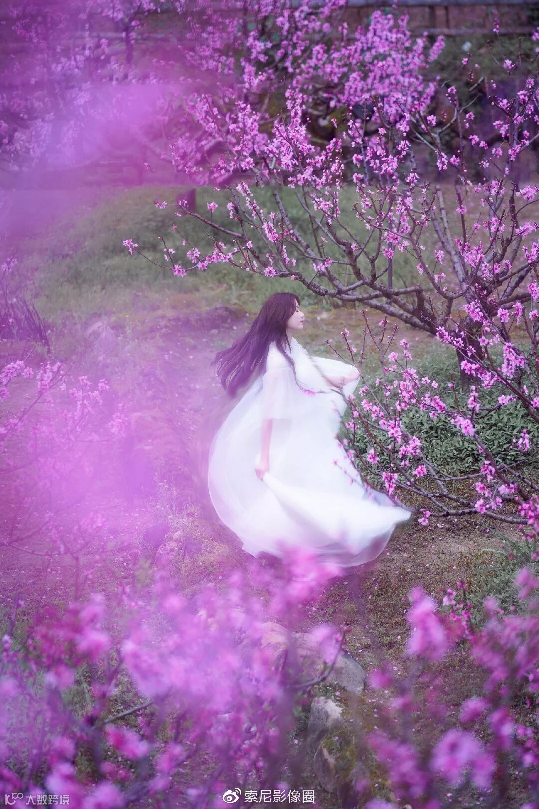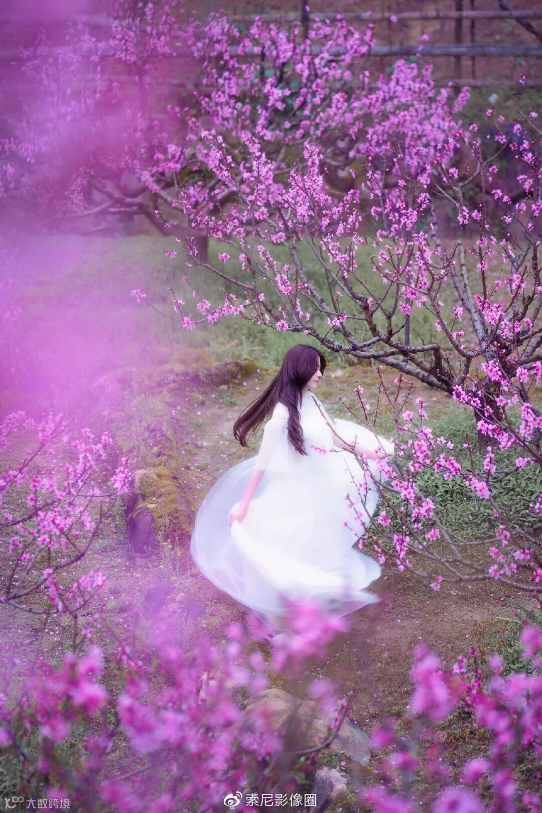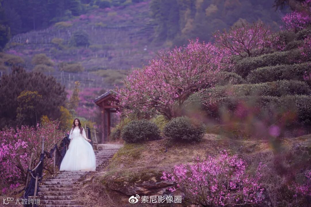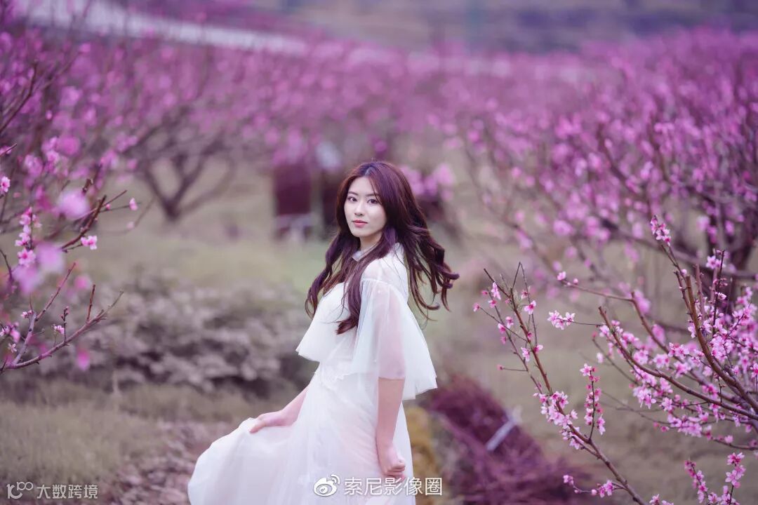 其实很早就想拍一组粉红色渲染的桃花人像了,奈何连续好些年都约不到心仪的模特。今年模特终于有档期了,恰逢索尼G大师镜头FE 135mm F1.8 GM到手,又特别适合这种桃花人像。其时,穆阳桃花节,正是漫山遍野桃花盛开的好日子。天时地利与人和,还有什么理由不能出大片。先上本组照片中最满意的一张。利用山地的高低落差,在高处俯拍,拍摄出模特位于桃花林中,翩翩起舞的感觉。拍摄时,找好机位,透过前景(虚化前景),找一片桃花环绕,并且不会挡住模特脸的地方。然后就是模特的表演。