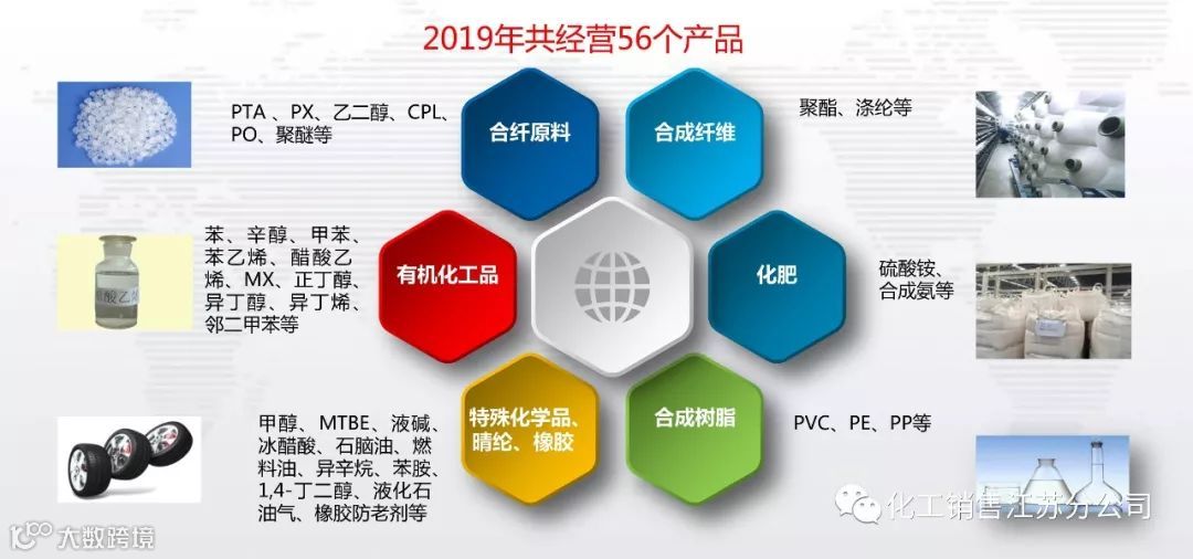 主要经营60余种化工原料及产品,包括PTA(精对苯二甲酸)、PX(对二甲苯)、甲醇、乙二醇、MTBE(甲基叔丁基醚)、苯、硫酸铵、PET(聚酯切片)、辛醇、CPL(己内酰胺)、甲苯、PO(环氧丙烷)、合成氨、苯乙烯、醋酸乙烯、液碱、MX(混二甲苯)、冰醋酸、正丁醇、石脑油、异丁醇、异辛烷、燃料油、异丁烯、PVC(聚氯乙烯)、PE(聚乙烯)、PP(聚丙烯)、丙烯等。