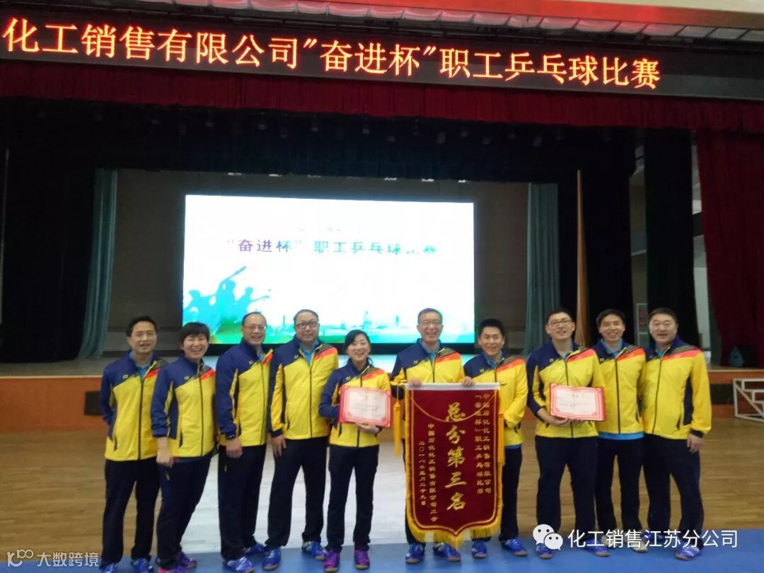 在化工销售“奋进杯”2018年职工乒乓球比赛中,公司获得“总分排名第三”“团体亚军”“领导组第三”的好成绩。
