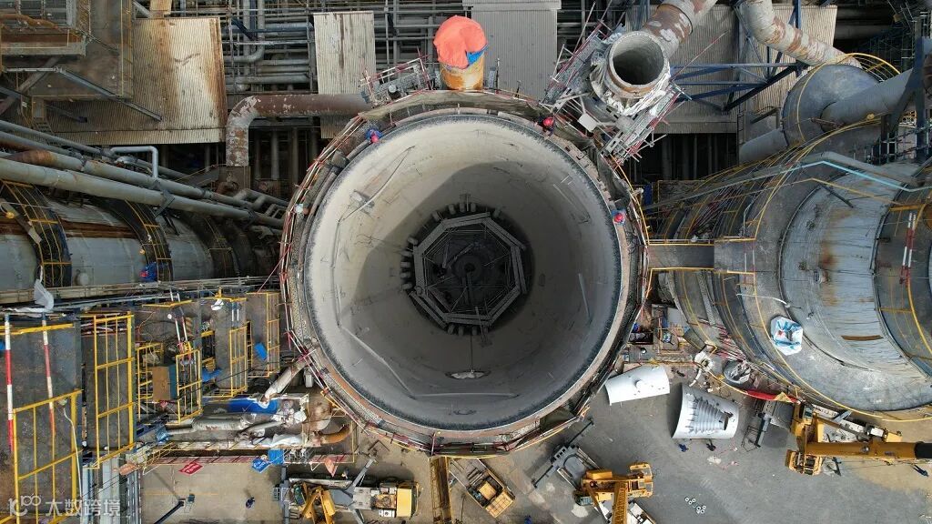 上午9时,在设备回装的4个小时里,安装三队杨金星的协调下,现场各工种通力配合,将锥段缓缓送至第一再生器筒体内,回装作业取得阶段性胜利。