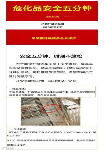 为全面提升储运系统员工安全素质,提高车间安全管理水平,从2023年开始推出《危化品安全五分钟》送学活动。通过车间微信群每日推送一期“危化品安全五分钟”。截至到目前已推送168期。其中包含安全小知识、安全挑错及附带标准、储运装置工艺设备操作知识等多种形式的内容。让员工每天掌握一个知识点,日积月累,确保安全理论学习走细走实。让安全成为习惯,用习惯保证安全!
