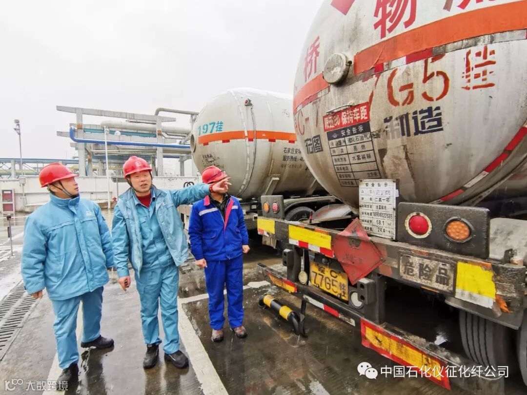 储运部配送工区危险化学品接货点,安全员和班组同志正在对危化品运输车辆进行雨雪天安全检查。张静 摄