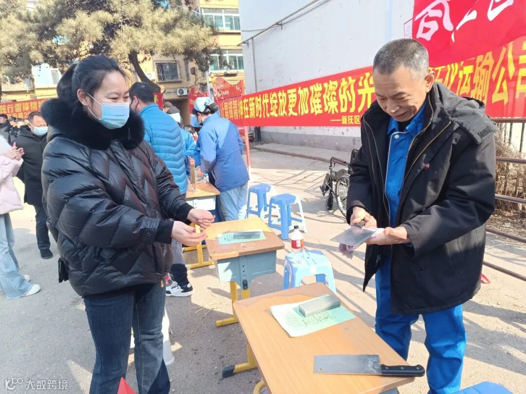 修理工张明辉和东部运输一中心管理人员鲁福生发挥钳工的特长,为社区居民提供磨刀、磨剪子志愿服务,活动现场张师傅坐在简易的工作台前,专心致志地打磨居民送来的剪刀、菜刀,边磨边用大拇指试刀锋,社区居民们一边等待张师傅磨刀,一边饶有兴致地观看磨刀过程,喜悦之情溢于言表,他们以精湛的技术赢得居民的称赞。