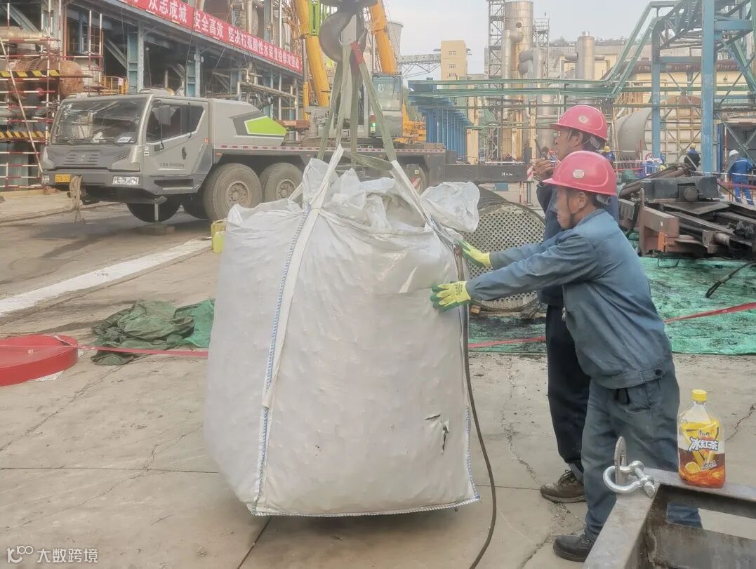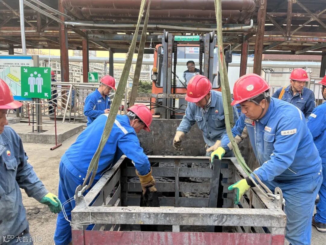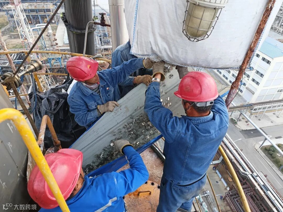 塔内填料由于结垢互相粘连,有的粘连到塔盘通道板上,使得填料运出十分困难。施工人员先用工具一点点地解除粘连块,再用钩子将填料钩出来,共计掏出6立方米填料,装入9个吨袋中吊装至地面。