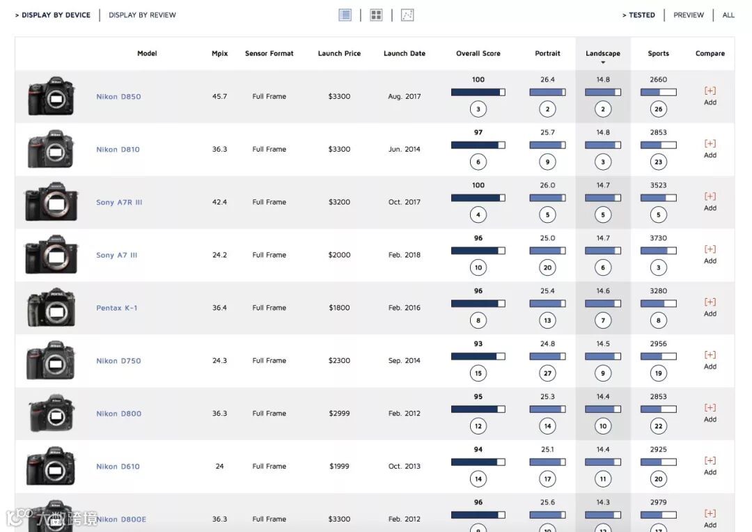 宽容度就是相机储存光学反差的范围,也就是说能够存储的最高亮度和最低亮度的区间。这个区间越大,宽容度就越高。而存储这个宽容度的数码格式,称之为RAW。(索尼的文件后缀是ARW)。通常情况下,相机的ISO为100时,宽容度到达最高水准。ISO升高后,宽容度会逐渐下降。那么A7M3的15级宽容度,在全画幅相机中,是什么水准呢?给大家看一组DXO的测试数据。