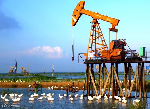 “磕头机”在水中采油,鹅在水中补食,人与自然和谐相处。