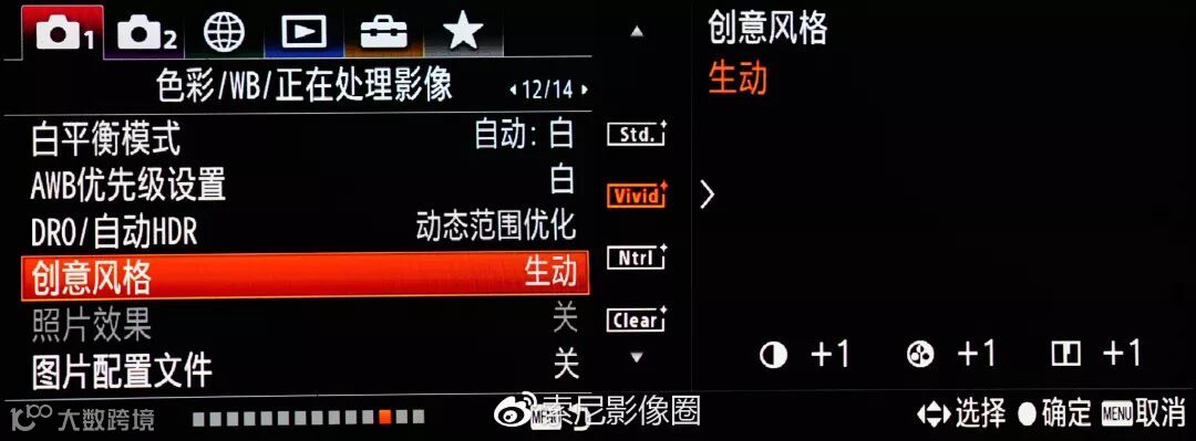 2、创意风格选择生动。对比度+1、清晰度+1、饱和度+1。这么做的目的,是为了让颜色更加鲜艳饱满。这个应该jPG直出设置中对色彩效果影响最大的选项,能让你的照片瞬间变得艳丽。