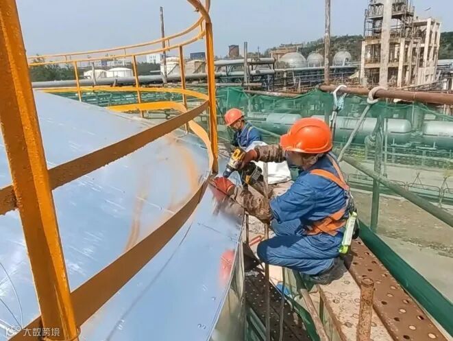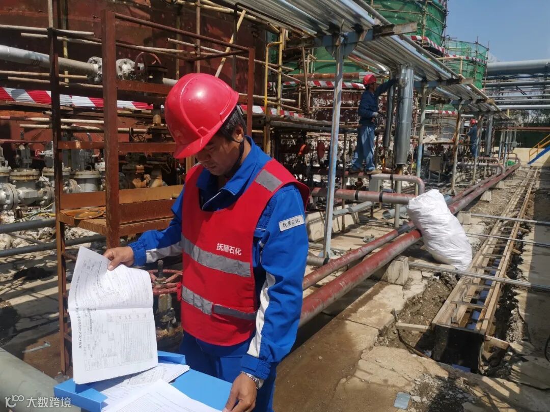 在腈纶厂罐区施工作业现场,监护人员认真负责核对作业票各项是否符合要求。