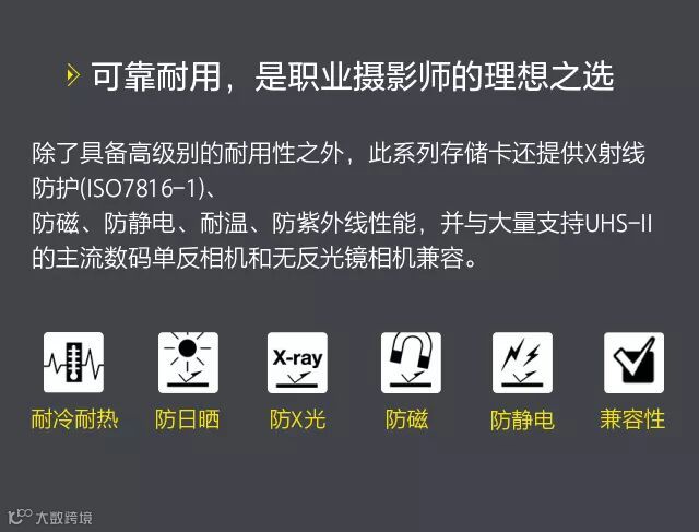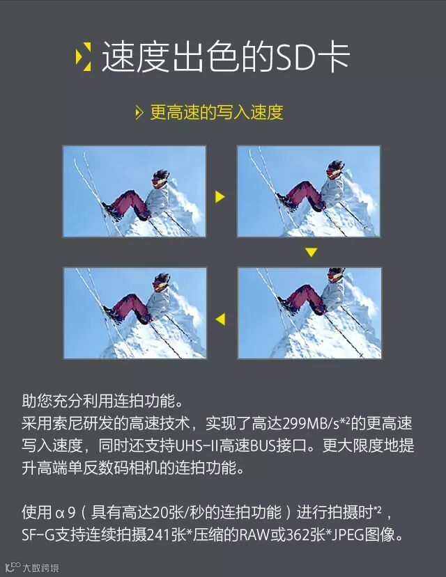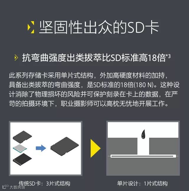 索尼推出新款SD卡,即“SF-G系列TOUGH规格”UHS-II格式SD卡。考虑到专业摄影师对于SD卡内文件安全性的需求,新款SF-G系列TOUGH规格卡整合了以下特性:速度出众、抗弯曲强度达到180牛顿、抗坠落高度达到5米。针对那些经常在恶劣环境中苦苦追求高品质照片的专业摄影师,SF-G系列TOUGH规格SD卡,还可提供IPX8级别的防水性能和IP6X级别的防尘性能。