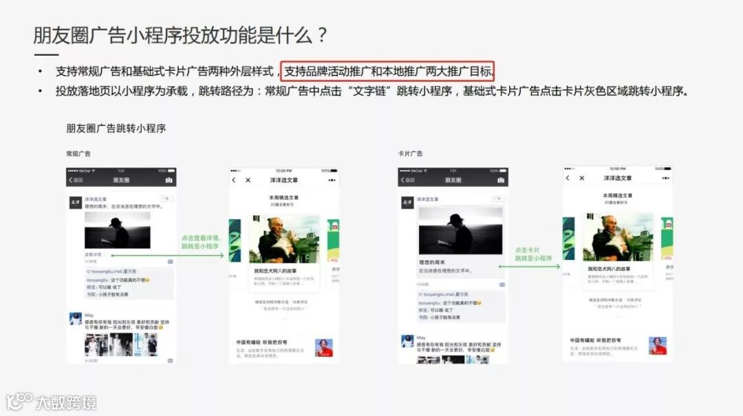 微信更新的官方文档显示,朋友圈广告小程序投放功能支持两大推广目标与两大展示方式。