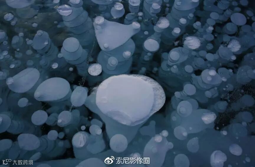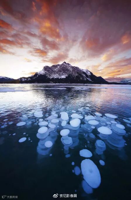 冰泡泡湖学名亚伯拉罕湖(Abraham Lake),是一个在北萨斯喀彻温河上建坝蓄水形成的人工湖。由于在湖底有各种有机物,其腐烂产生的沼气,会形成水泡往上冒。到了冬天结冰之时气体被凝固在冰中,形成了一层又一层神奇的冰泡泡。同时,由于亚伯拉罕湖位于河谷地带,冬天降水量不多,而且风力强劲,湖面上积不起很厚的雪,人们才有机会去见识这一有趣的自然奇观。在泡泡湖拍摄时,我们遇到了非常大的暴雪天气,我整个人要匍匐在冰面上前行。风停之后,我拍摄下了冰泡泡湖最美的时刻。