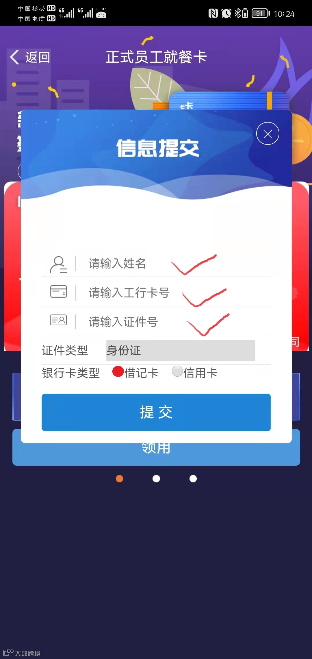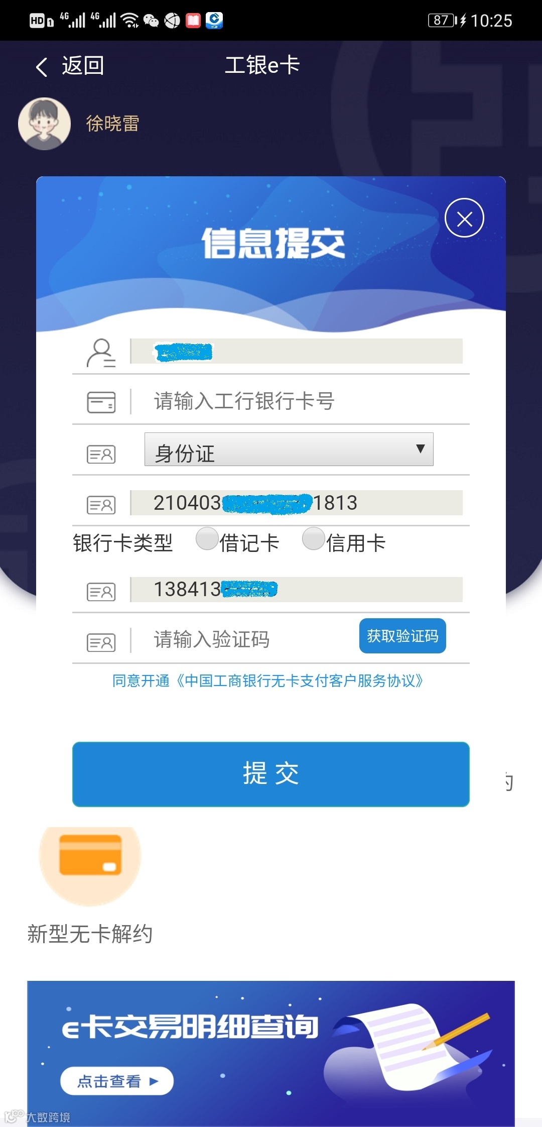 领卡时输入“姓名”“支付工行卡号”“身份证号码”“卡类型”后提交。