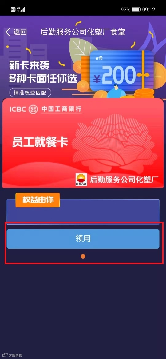 进入“智慧食堂”页面后点击“会员e卡”选择“员工就餐卡”点击领用