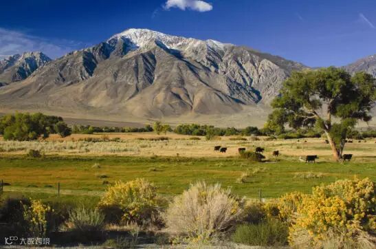 ▲拍摄时在画面最底加上一些植物前景,丰富相片内容,又不会太惹人注目,分散注意力。中景有棵大树和牛只,而远方又有座雪山,使画面有前有后,不会只有单一的平面。