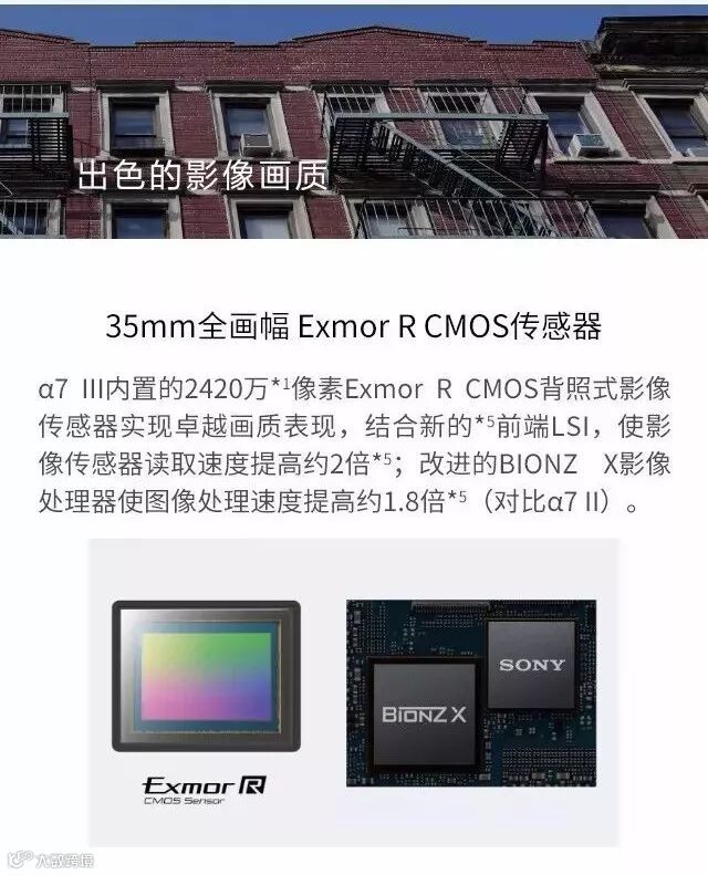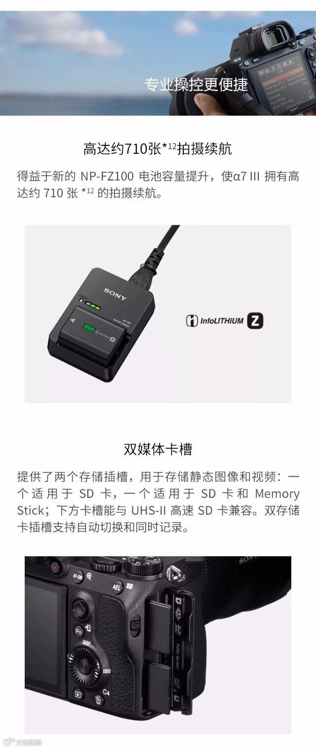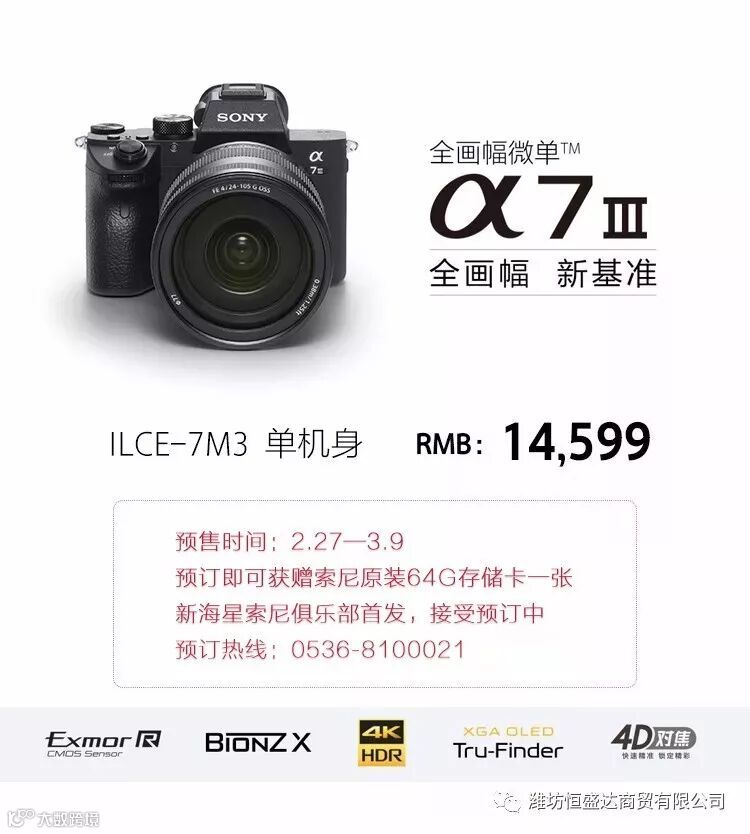 2018年02月27日,索尼(中国)有限公司正式发布新款全画幅微单A7M3(型号名:ILCE-7M3),配备新研发的2420万像素Exmor R CMOS背照式影像传感器,覆盖ISO100-51200(静态图像可扩展至ISO50-204800)感光度范围,并具备15级的宽广动态范围/宽容度。A7M3先进的自动对焦系统拥有可覆盖约93%取景范围693个相位检测和425个对比度检测对焦点,支持眼控对焦。A7M3具备在AF/AE追踪模式下最多10张/秒的高速连拍功能,且无论电子静音还是机械快门均可达到该数值。此外,相机支持5级5轴防抖、全像素读取4K视频拍摄、高达710张的拍摄续航、多功能摇杆、双媒体卡槽、高速Type-C USB 3.1接口等功能。新海星索尼俱乐部将首发这款新机,现已接收预订,预订热线:0536-8100021。