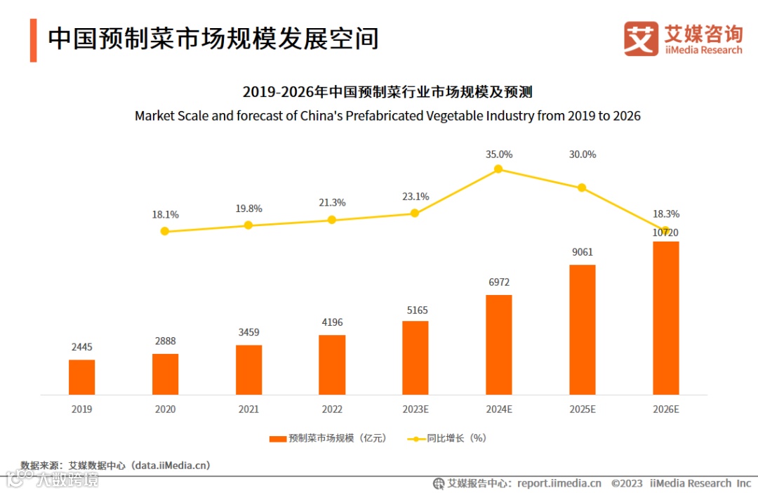 iiMedia Research(艾媒咨询)数据显示,2022年中国预制菜市场规模为4196亿元,同比增长21.3%,预计未来中国预制菜市场保持较高的增长速度,2026年预制菜市场规模将达10720亿元。预制菜有效地降低了餐厅运营成本,顺应了当下消费者便捷、营养的饮食需求,吸引各大连锁餐饮品牌入行布局。