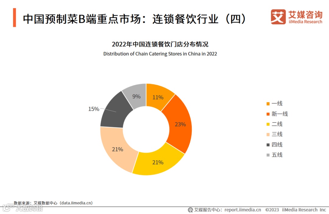 iiMedia Research(艾媒咨询)数据显示,新一线城市中连锁餐饮企业的门店分布得最多,占比达到23%;其次一线城市也相对较多,占比达11%。总体而言,二线及以上等级的城市累计达到55%的比重。它们的经济实力、居民消费能力远远强于其他城市,餐饮连锁企业纷纷在该地布局。