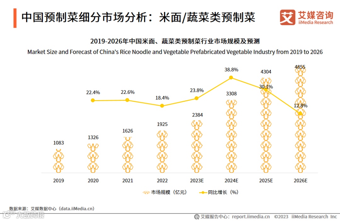 iiMedia Research(艾媒咨询)数据显示,2022年中国米面、蔬菜类预制菜行业市场规模为1925亿元,同比增长18.4%,预计2026年中国米面、蔬菜类预制菜行业市场规模将达4855亿元。米面、蔬菜构成人们基本饮食结构,米面、蔬菜类预制菜行业将持续扩大市场规模以满足消费者需要。