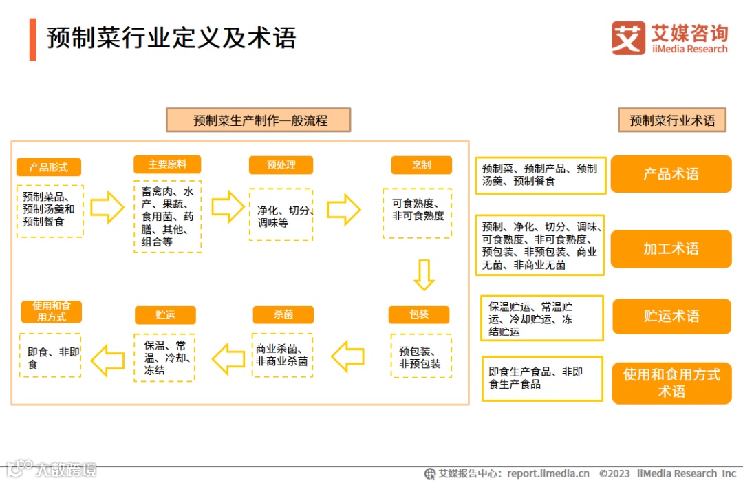预制菜指以食用农产品及其制品为主要原料,添加或不添调味料等辅料,经净化、切分、调味、烹饪/熟制、包装、杀菌等全部或部分工序及不同工序顺序的预制处理并在一定条件下贮运,可即食和非即食的菜肴等食品,包括预制菜品、预制汤羹和预制餐食。