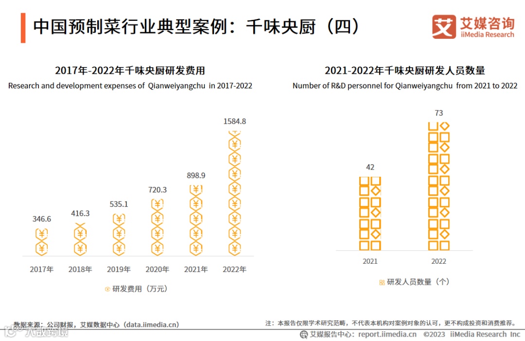 数据显示,2017年-2022年,千味央厨研发费用投入逐年增多。其中,2022年的研发费用为1584.8万元,同比增长 76.29%。与此同时,2022 年千味央厨研发人员达到73 人,同比增加了 73.81%。近年来各大预制菜企业愈发重视产品研发,试图抢占预制菜赛道先机,占据市场份额。
