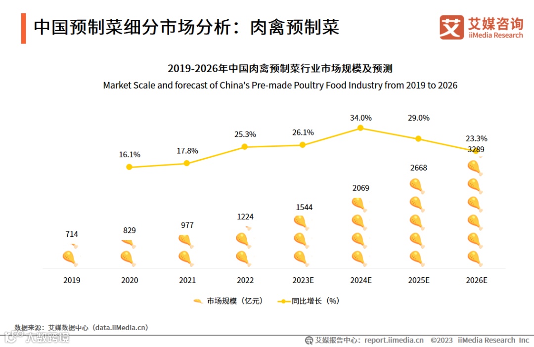 iiMedia Research(艾媒咨询)数据显示,2022年中国肉禽预制菜行业规模为1224亿元,同比增长25.3%,预计未来中国肉禽预制菜市场规模将持续扩大,2026年肉禽预制菜市场规模将达3289亿元。随着人们生活条件改善,肉制品市场的需求量将持续上升,且上涨速度加快。