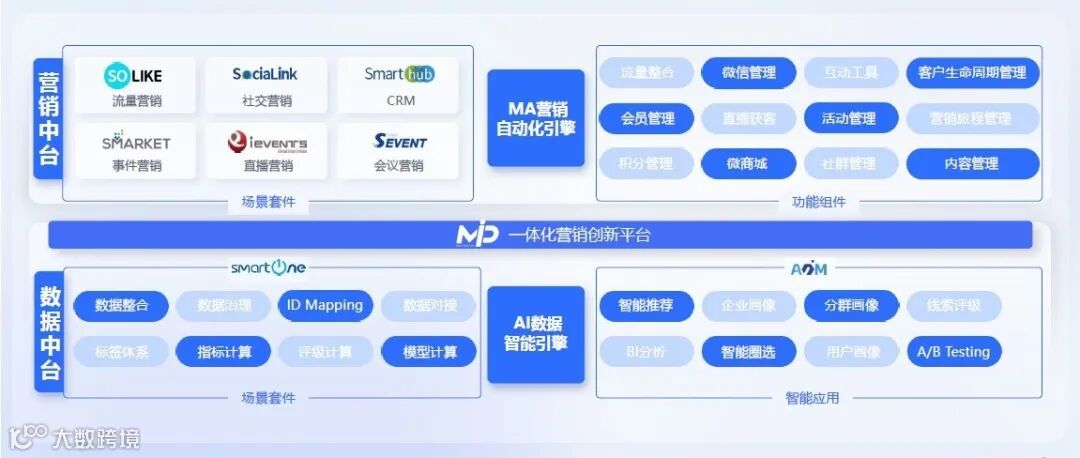 MIP搭载了双中台——营销中台、数据中台;双引擎——MA营销自动化引擎、AI智能引擎。在双中台上,产品组件集成化的设计,使客户能够按需选择、灵活组合匹配自身业务场景的营销数字化平台,实现“像乐高一样随意组合” ;同时一体化架构确保客户在未来数字化发展阶段,可以弹性升级,无缝衔接 。