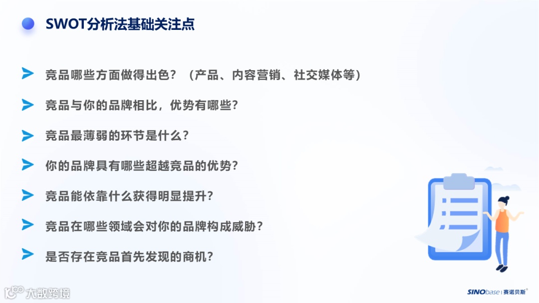 12、执行SWOT分析法,了解竞品的优劣势和机遇威胁