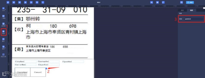 ② 表格设置:选择左侧【表格】,按需选择行数和列数,选中电子面单中的表格,点击右上 角蓝色图标,在右侧编辑区域选择【配置】,数据中填入 goodsList