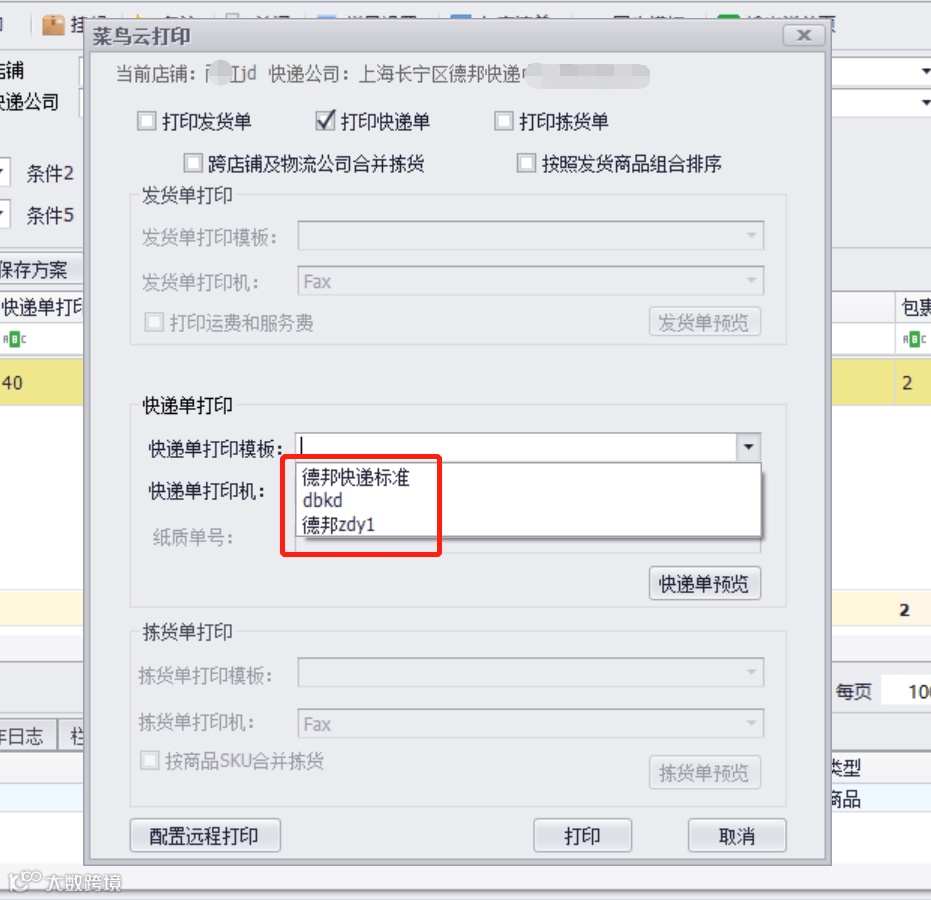 第四步:下拉选择【快递单打印模板】(根据快递公司显示对应快递单模板),点击【打印】进行打印面单。