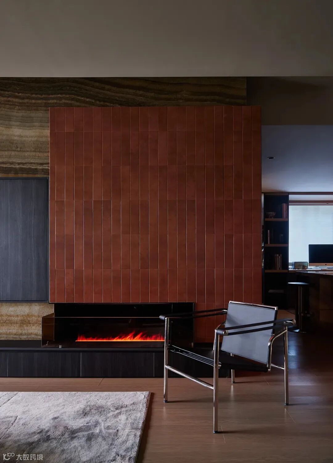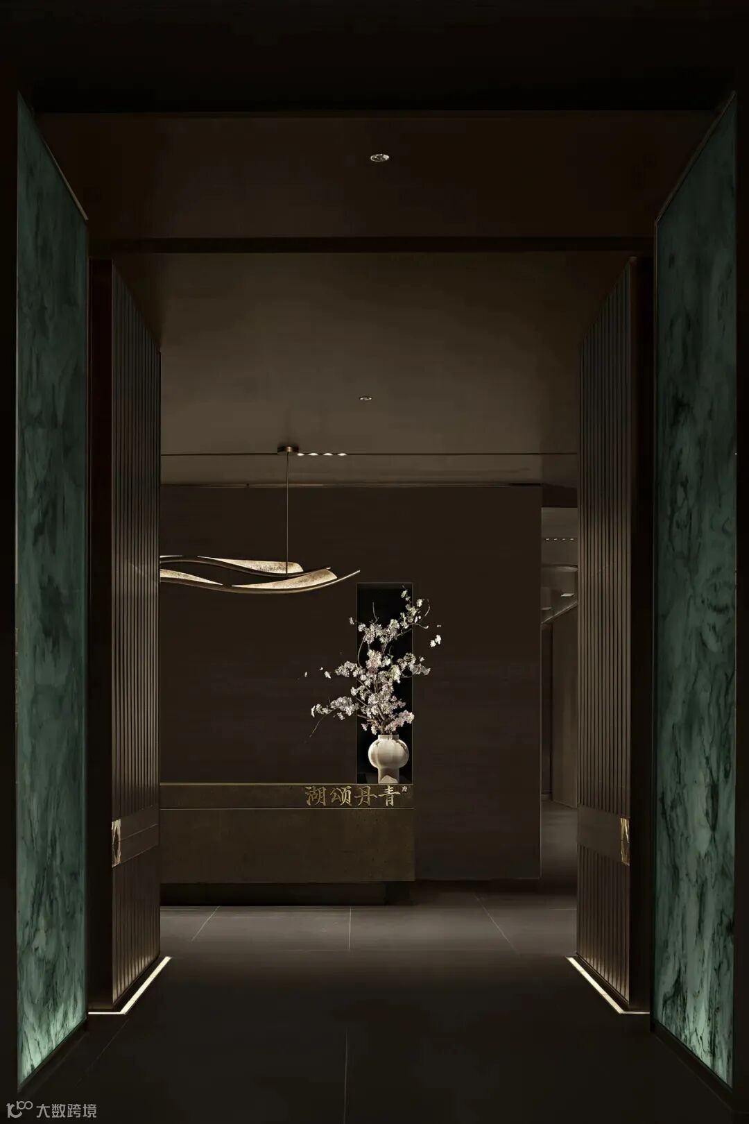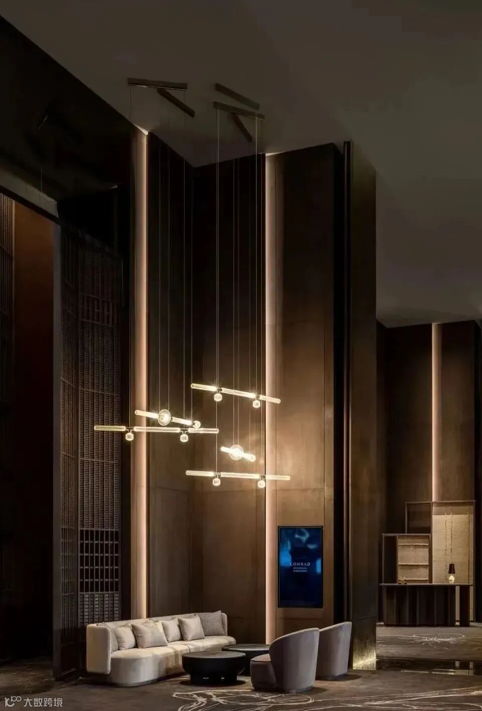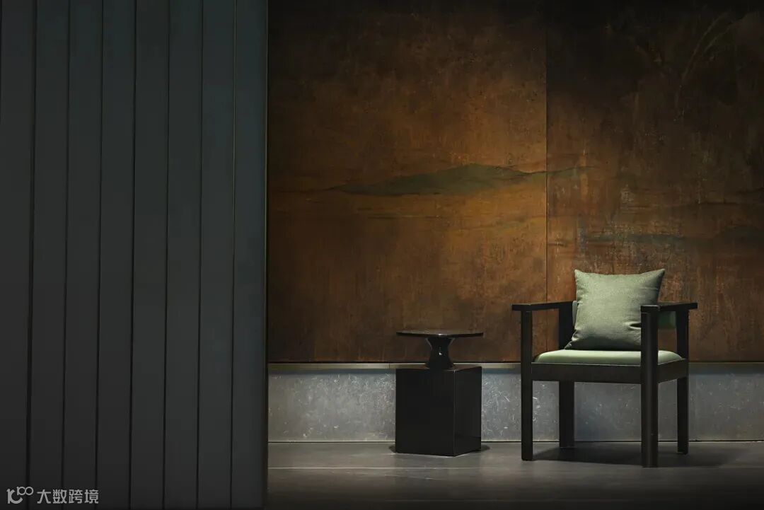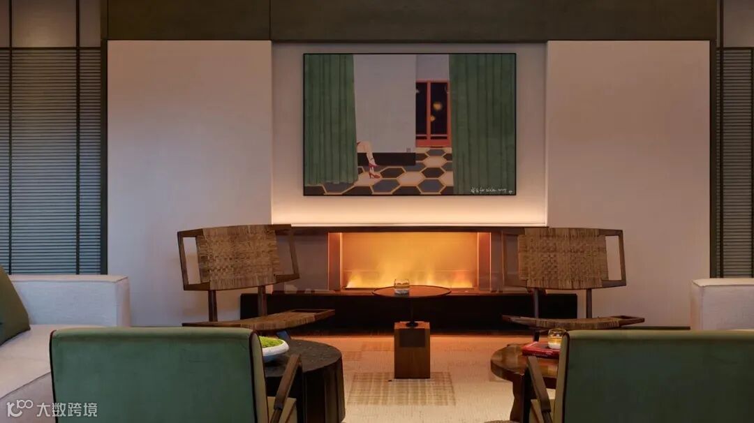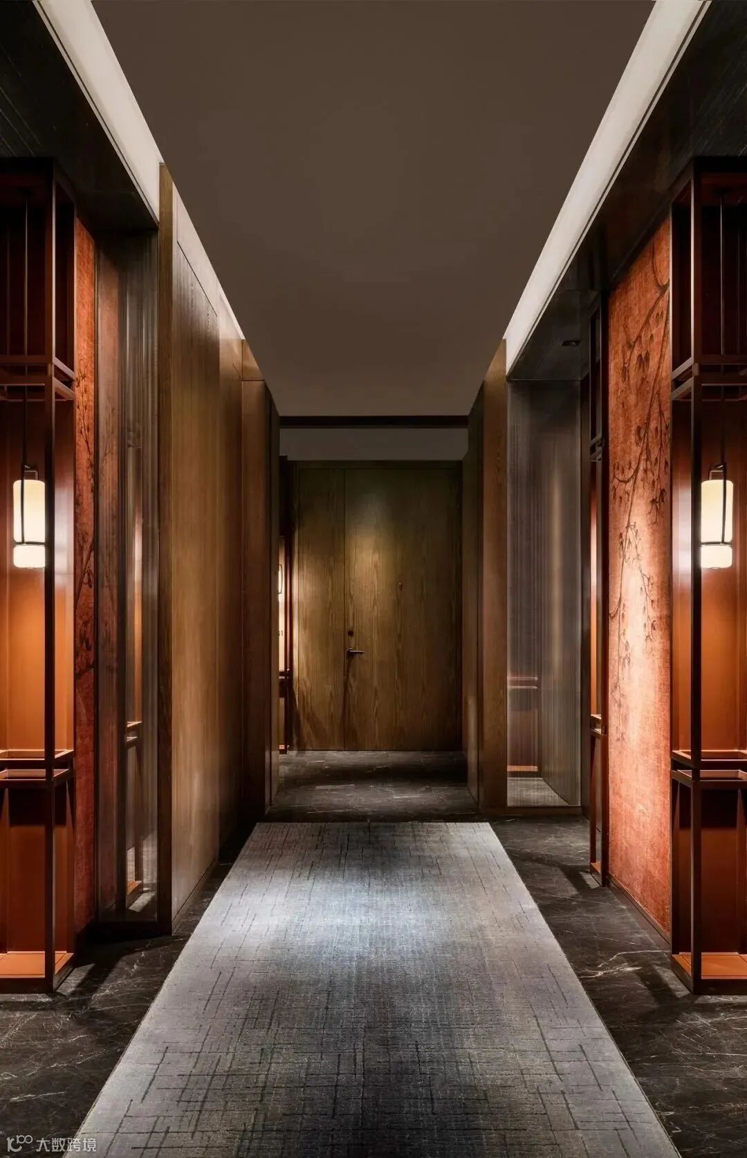 转身来到接待台两侧的走廊,其采用做旧工艺的格子门一一串起,造就宅门与游廊相结合的氛围,廊道尽头的LED屏幕播放山水映画,令整个大堂充满古今交融的气质,将传统美学与现代艺术的混搭发挥得淋漓尽致。