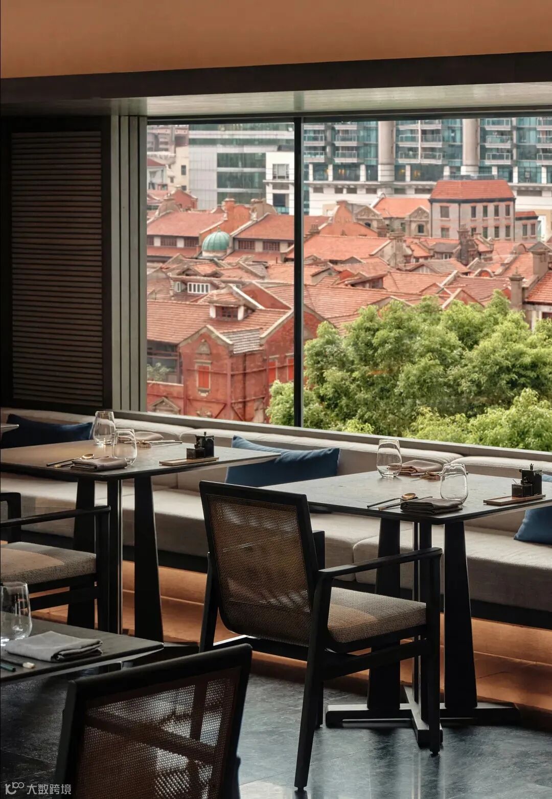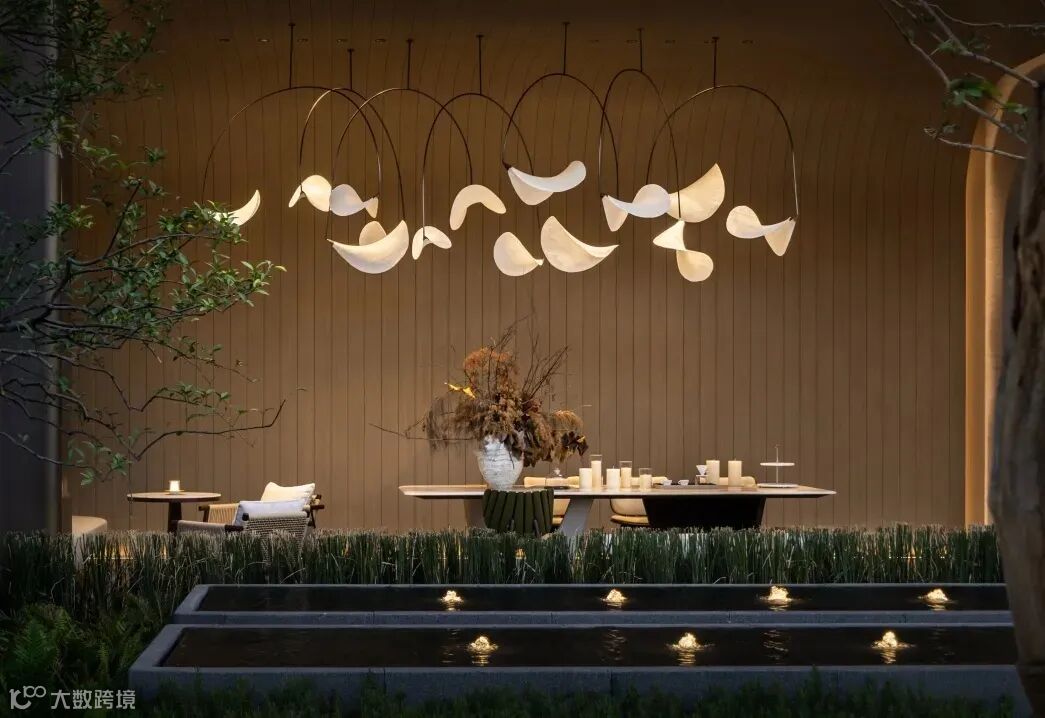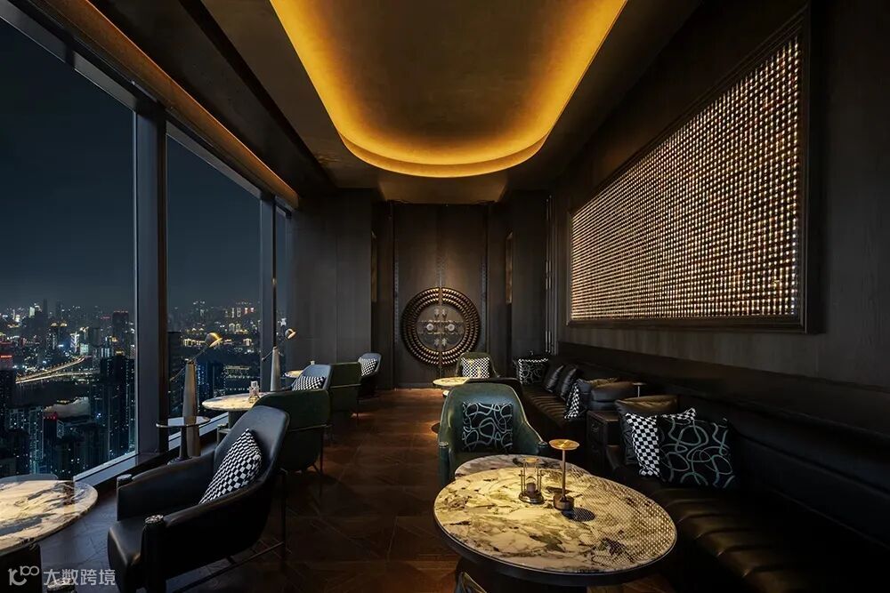 同层户外的「徊」酒吧,以墨色与金为主调,汲取了传统建筑中悬鱼与垂柱的设计元素,沉静的同时也饱含格调。