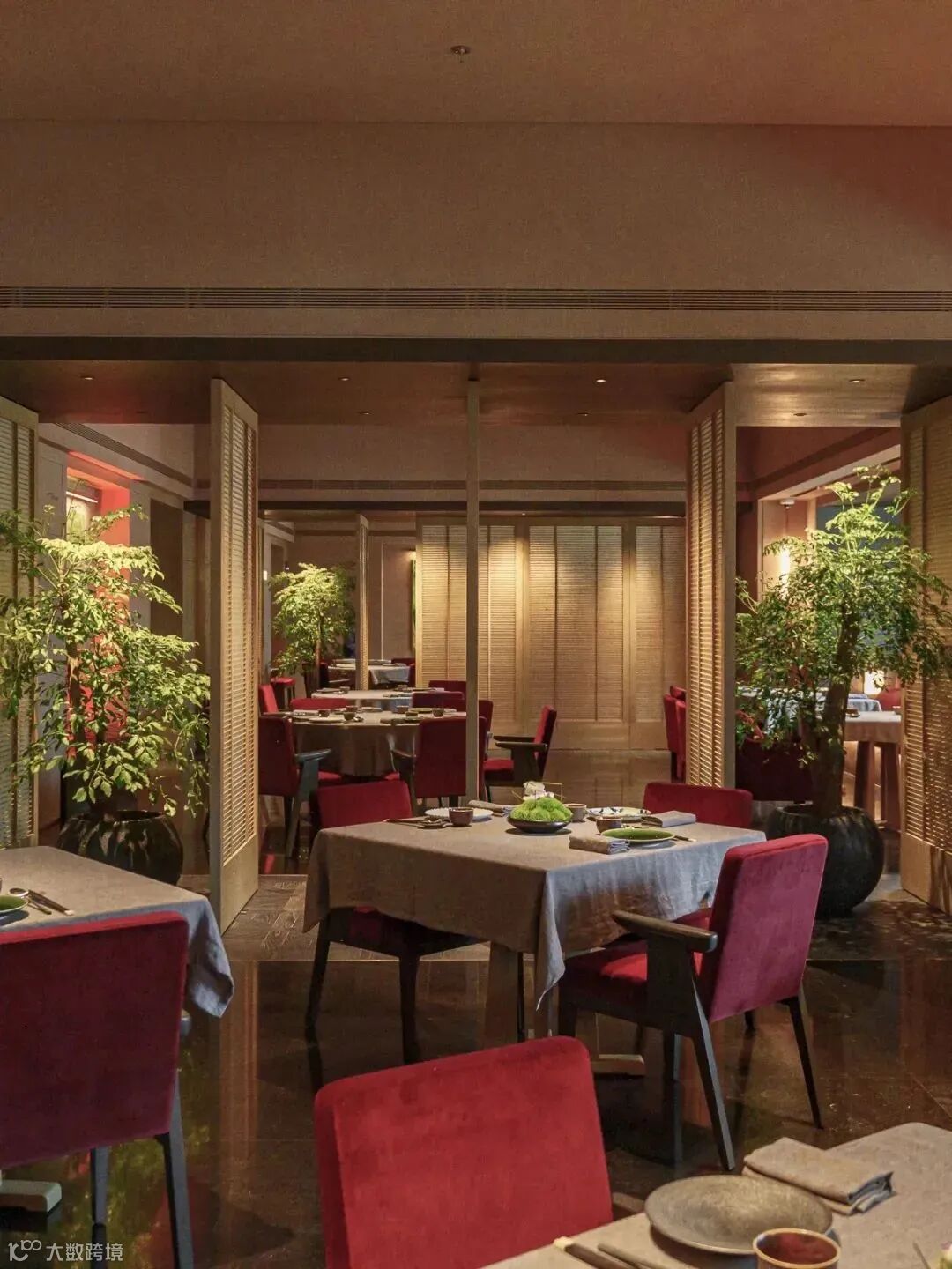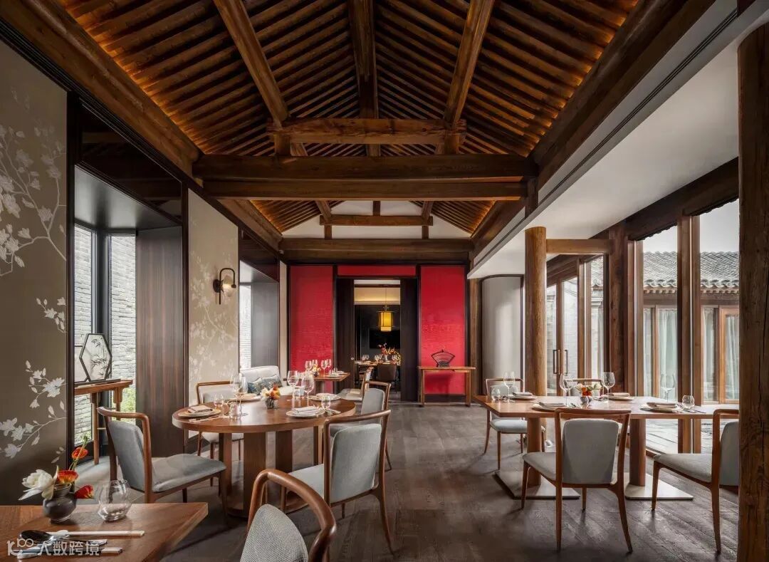 中餐厅「胤呈」落于一片水域中央,可穿过道道连廊,涉水而行,悠然抵达。极富结构感的天花设计与国花牡丹的花纹、格栅相融合,让古时风物细琐,浸润在现代生活风尚中。