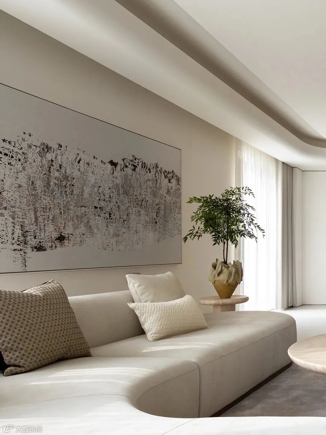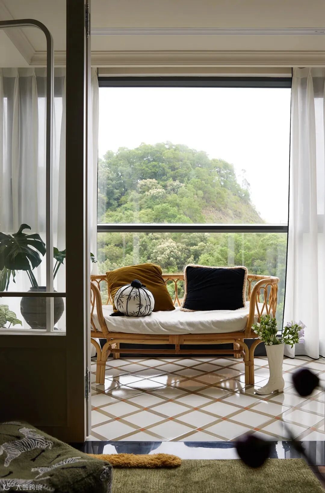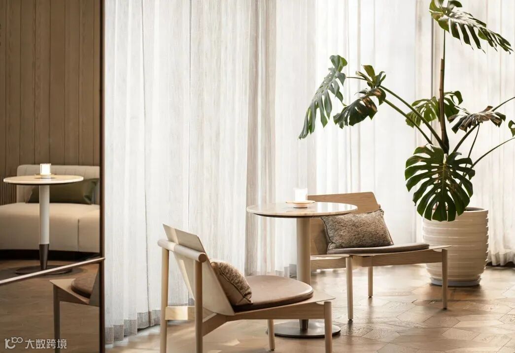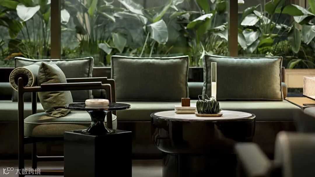 以浅米白色系奠定整个空间色彩体系的基调,在柔和的色彩基础上增添绿色元素。这里的“绿色”不仅体现在软装的运用上,还体现在植物体系的运用上,二者共同营造出室内“岭南庭院”的清新感。