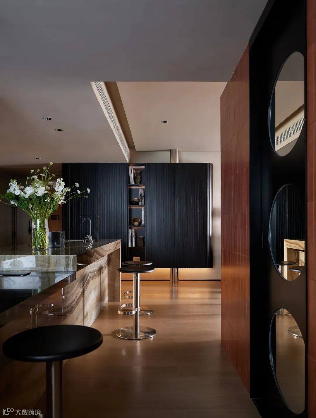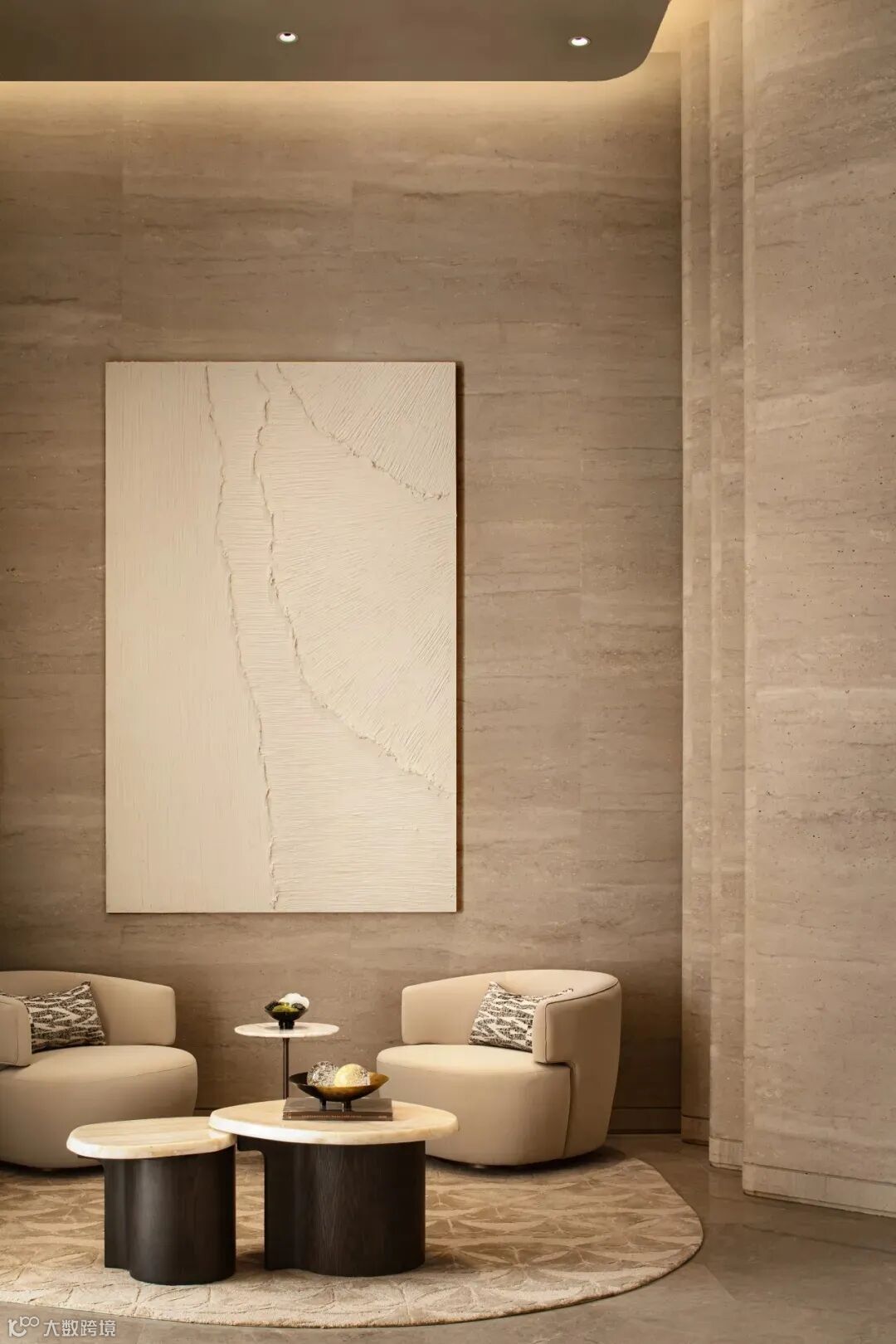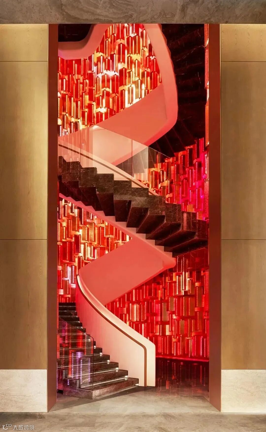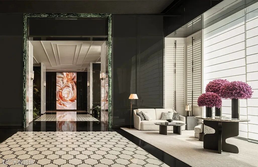 一层迎客区,有大理石铸造的框体结构,对应蜿蜒向上的旋转楼梯,联结间仿若层层礼序,引导着宾客的行走动线。