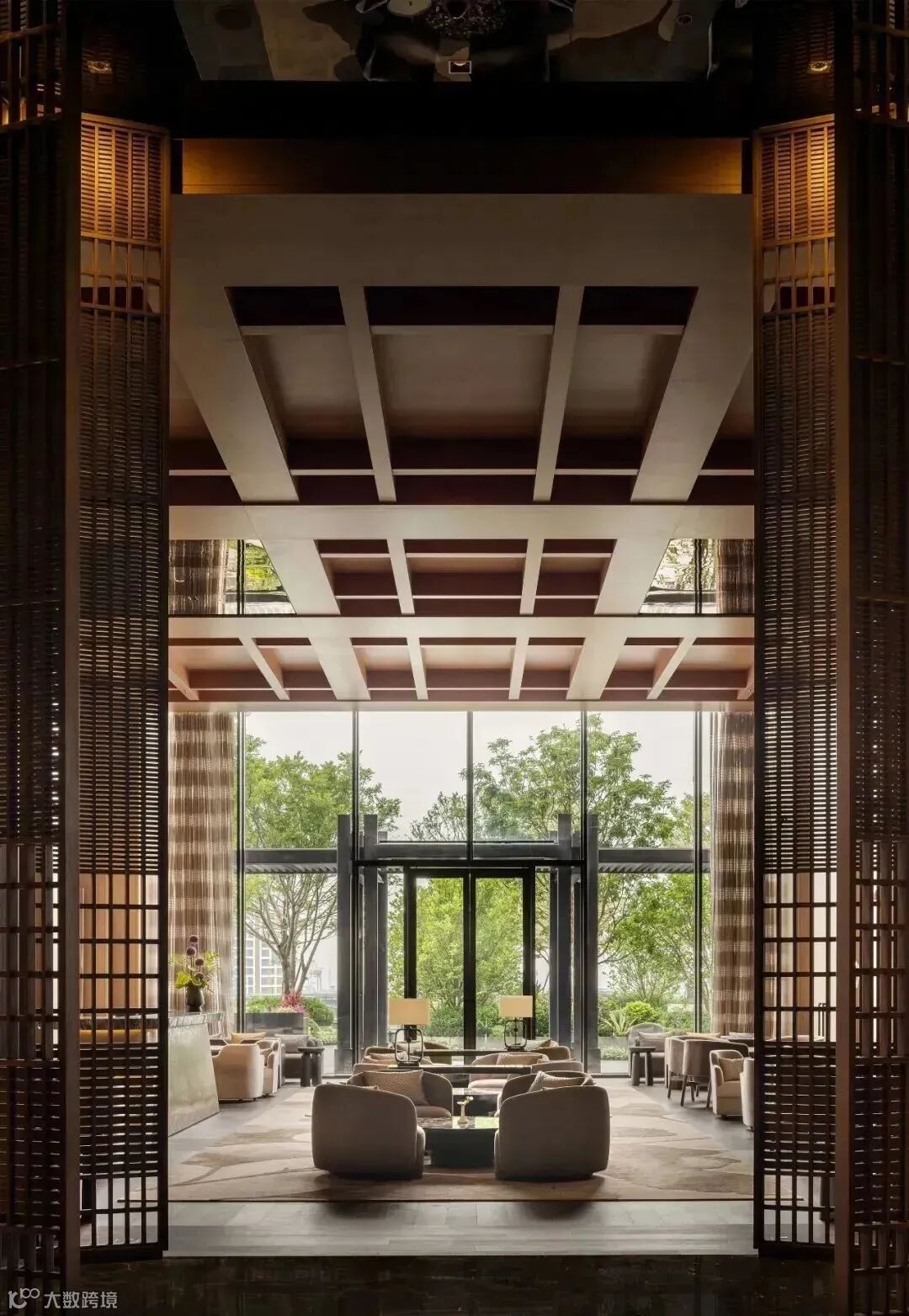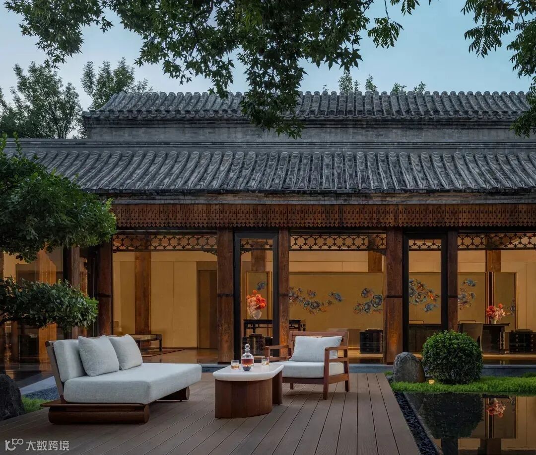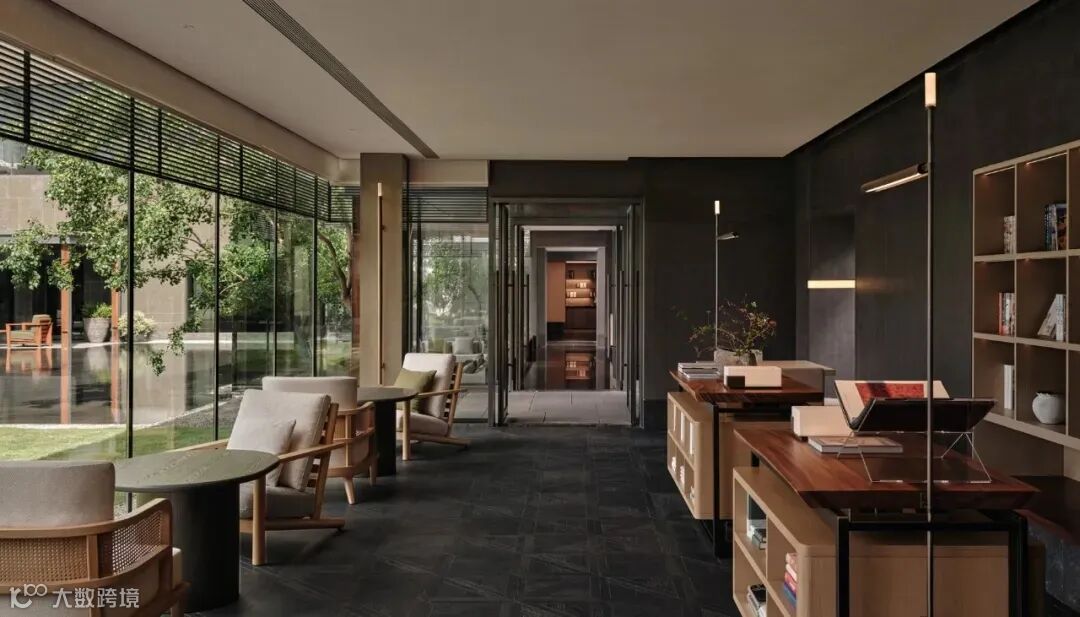 顺着另一侧的一层接待厅上行至酒店五层的大堂,高阔空间整体遵循了中国古代宅邸三进三出的格局样貌,颇有礼序之道。