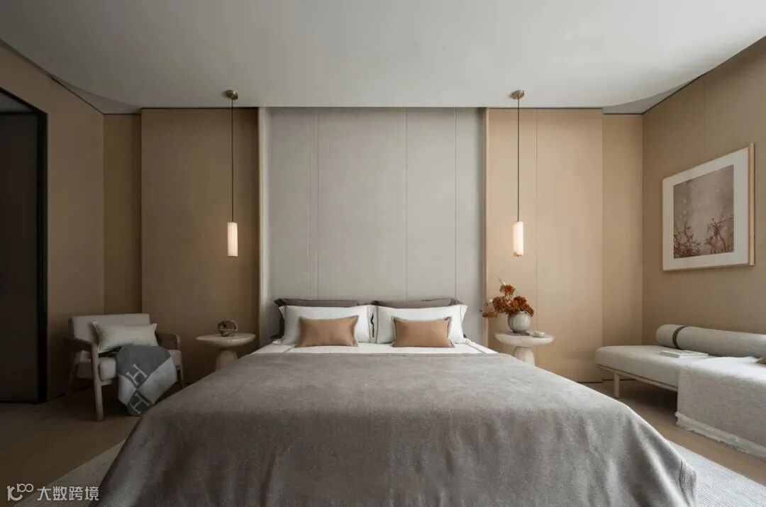 整个卧室主打现代简约风格,有着统一的优雅格调,并无过多繁杂装饰。白色与灰色的主色调让空间看上去干净又明亮,和金色画框、黑色椅子等点缀色形成强烈对比,既凸显重点,又维持了整体的统一感。