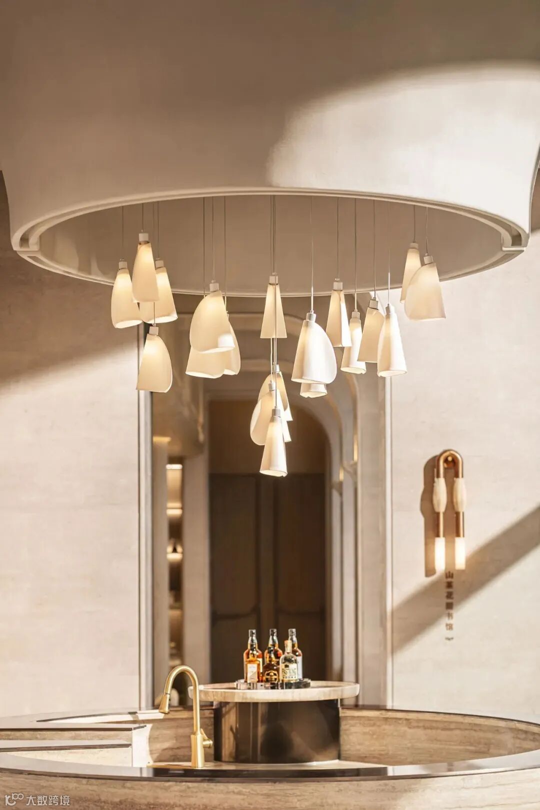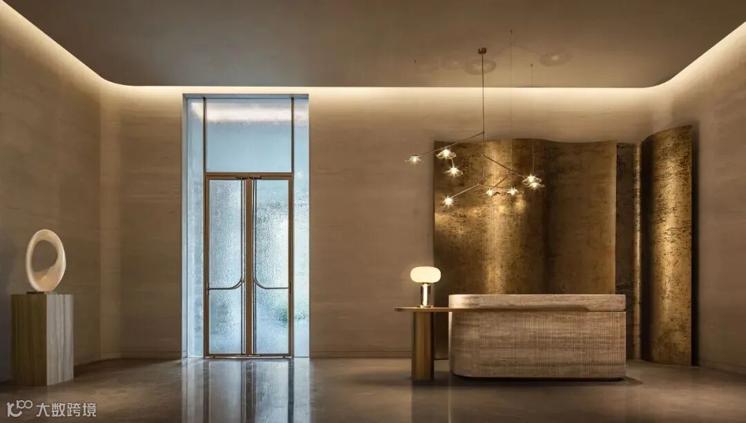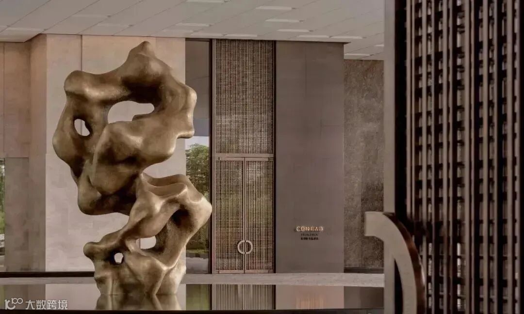 入口处的圆形水景,对应金色的穹顶,置于其间的太湖石雕塑名为“两仪”,取自 《易经》中“太极生两仪,两仪生四象,四象生八卦”之意。