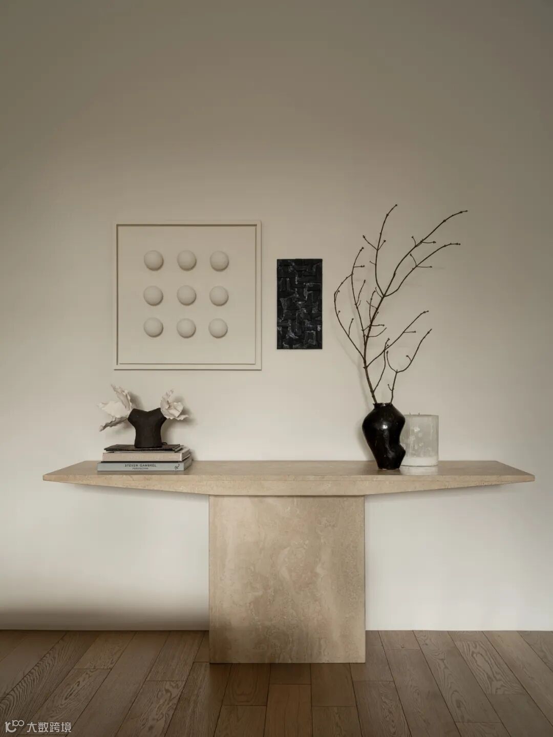 业主最初是希望室内为全白色的基调,经过沟通之后,Olga Manakova使用了偏向洞石颜色的暖色调,局部采用黑色作为点缀。设计师认为加入少量暖色与软和材质,会保持居室的舒适性与触感。另外,在选择材料时,着重是自然元素。