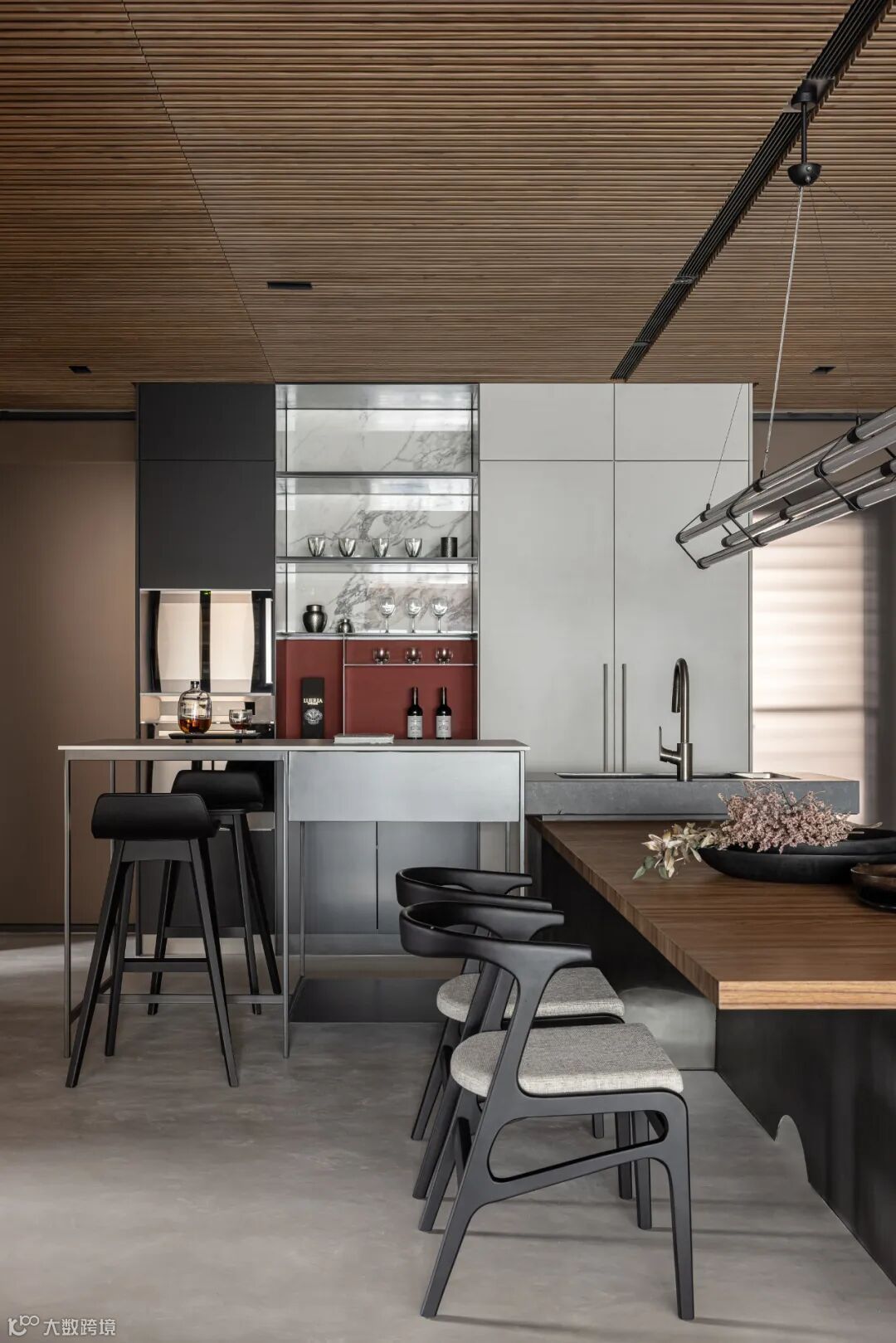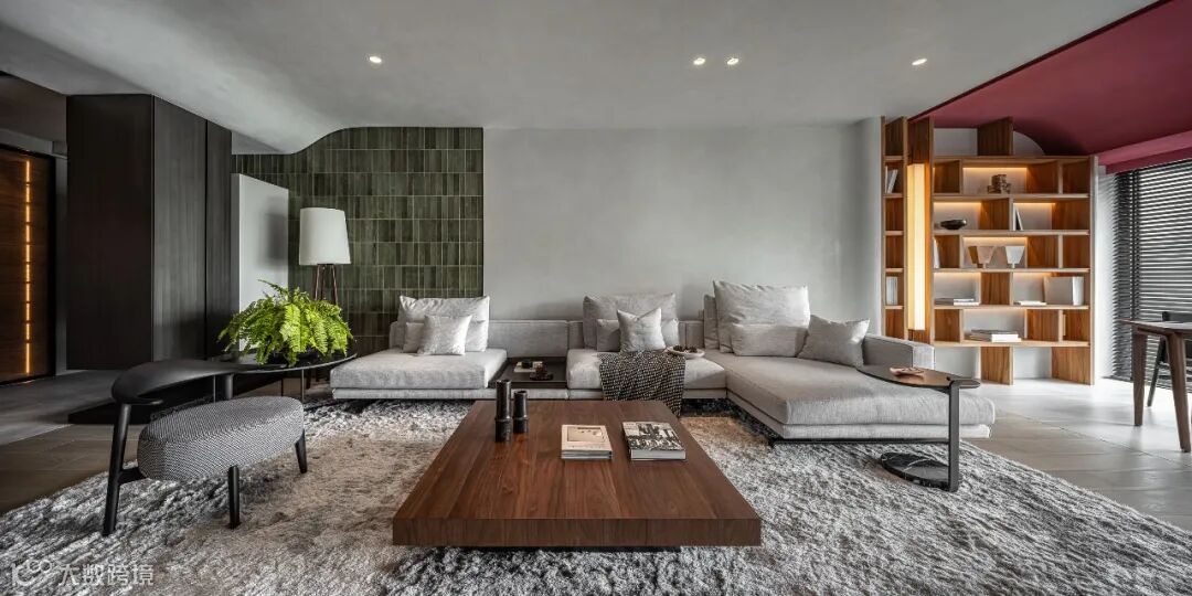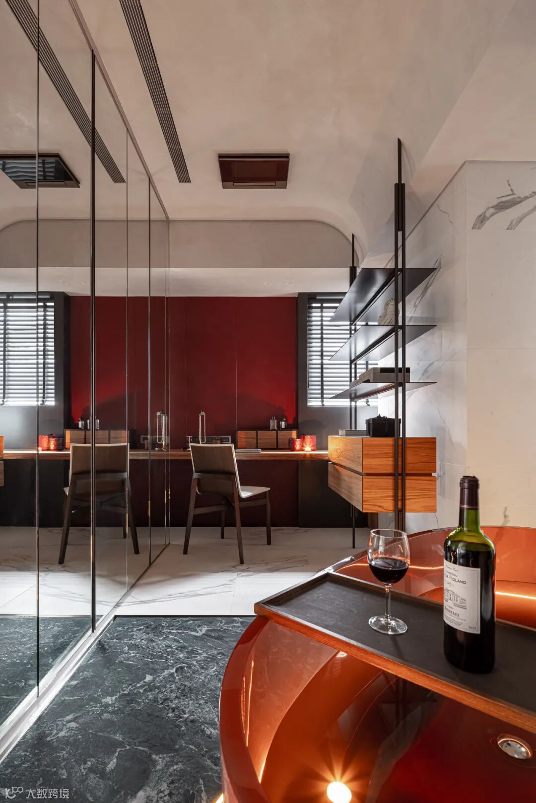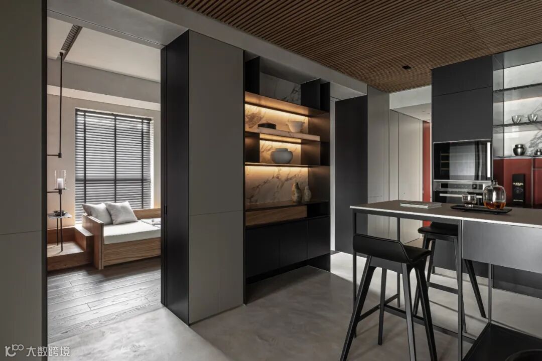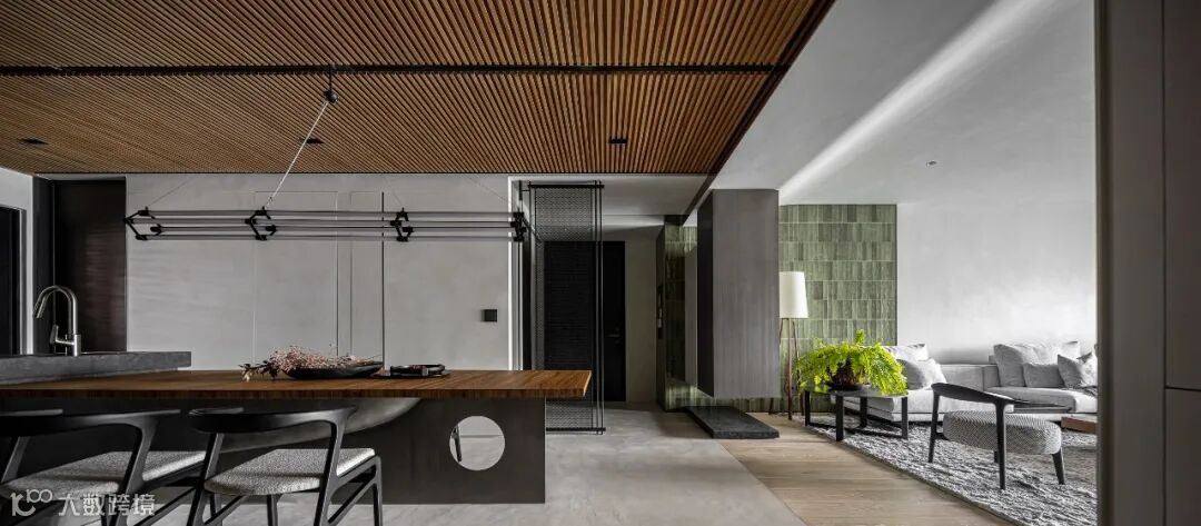 As the first visual focus of introduction area, restaurant area for whole space atmosphere of the spindle, use large area teak ceiling grille, cleverly conceal in the design of air conditioning maintenance hole, and become the main definition dining-room space tonal surface material. In coated mirror on the side of the girder across space, let more outspread vision, grille smallpox and frivolous curve along the ascension of the sitting room ceiling height, weaken the dimension sense of girders. Eat hutch around open display case, using the tonal collocation of red wine brick gray tiles, pervious to light stone, shading different light composed of micro luxury color temperature, make of eat hutch guest important areas.