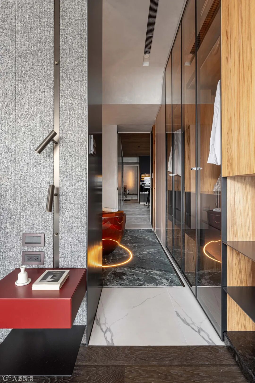 Open the tub area surrounded by dressing cabinet put oneself in another's position, translucent amber bath crock, center for the space. Bath crock bottom little fiber through the flow of liquid, and reflecting mirrors on the ceiling and all round the mirror cabinet put oneself in another's position constantly. The mist hazy, take a cup of eat hutch of red wine. Let the bath become a ritual of enjoying life.