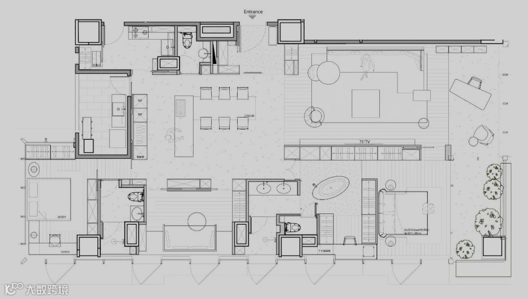 Planar configuration out of dining-room and sitting room space axis, and bath crock and dressing room as a boundary between public and private area center double open glyph each space use a line series, the introduction of outside natural light to a restaurant in the area, open design to maximize space use rate of linkage。