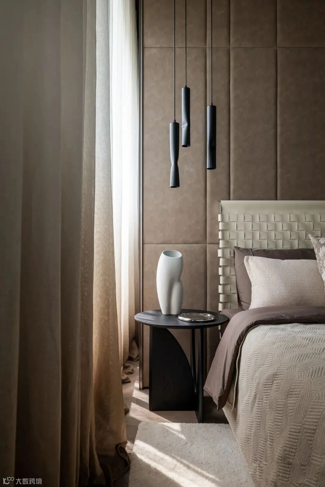 书房于卧室相连,用一方精神空间丰盈生活。主卧延续大厅的格调,皮革床头墙面延伸至卧床区后方的更衣间与卫浴间,以金属玻璃拉门界定,空间有序,通透,灵动。