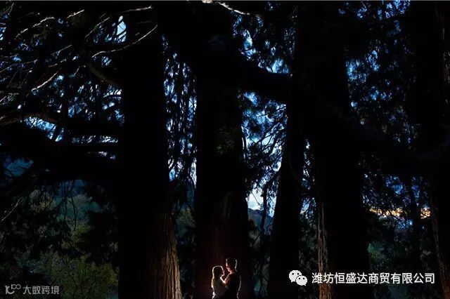 如下图,通过使用广角镜头,就能在画面制造出新人与树林之间的体型对比,照片也会更震撼。